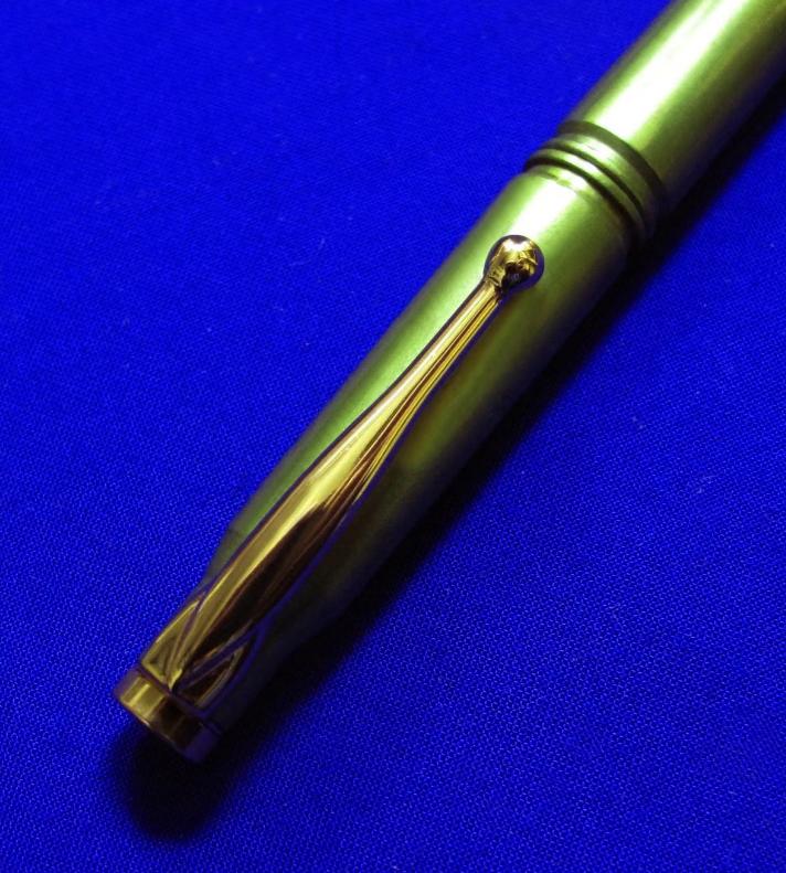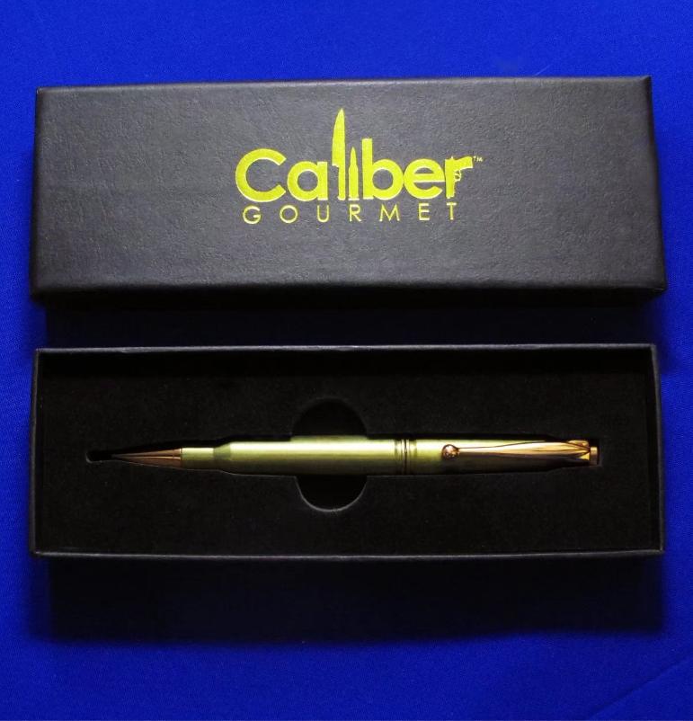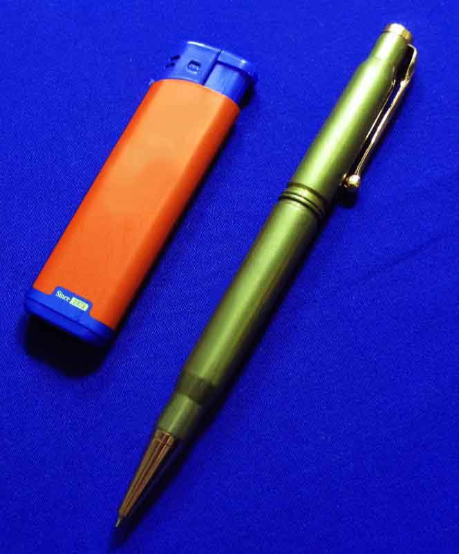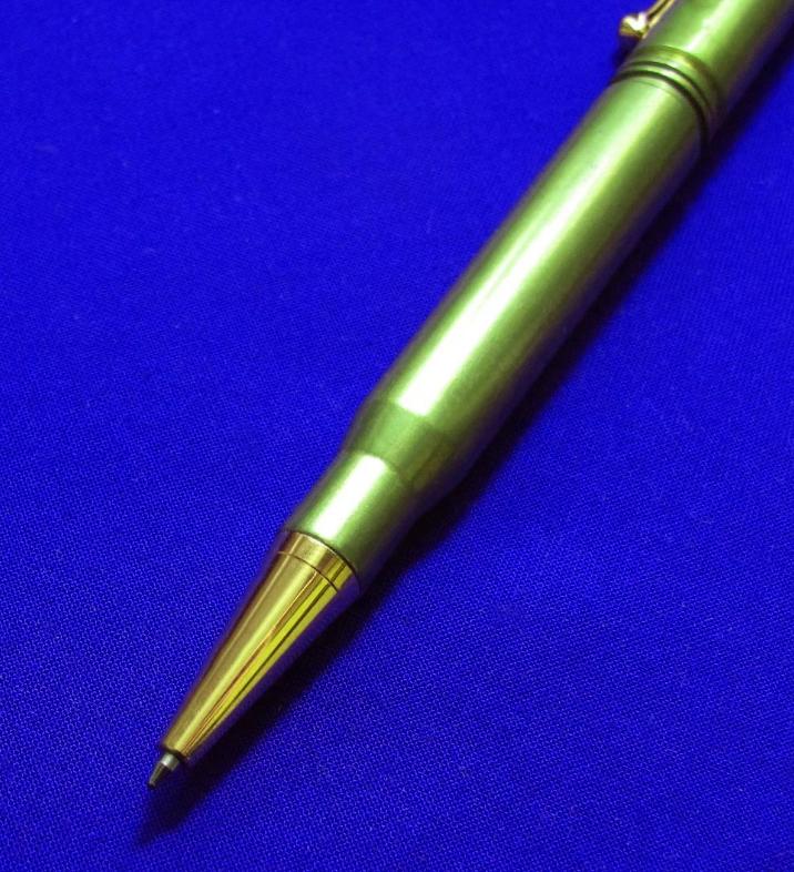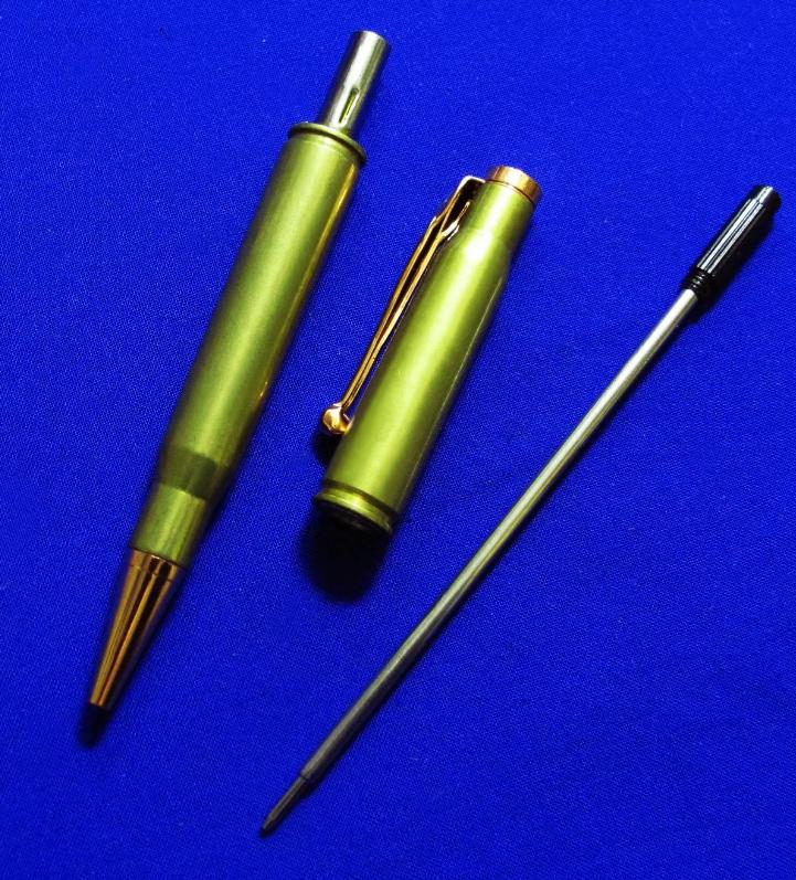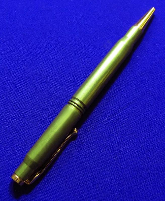 前部笔杆使用罕见的瑞典8X63毫米博福斯步枪弹制作, 后部笔杆使用北约7.62X51毫米步枪弹制作。 笔尖被加工为弹头造型。