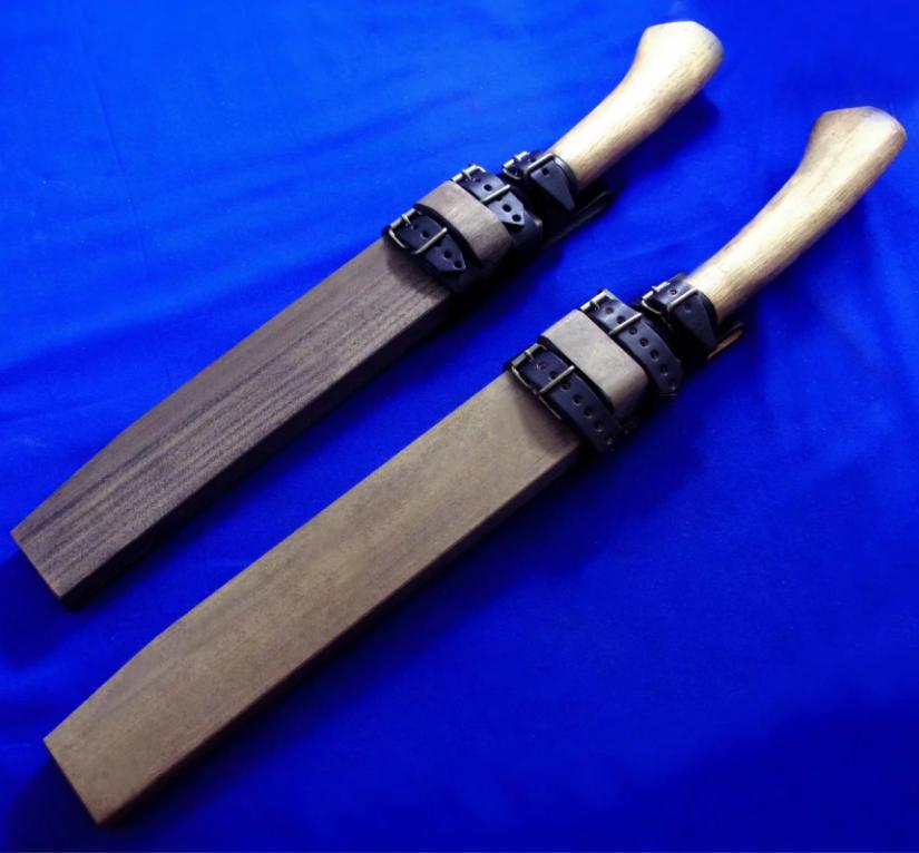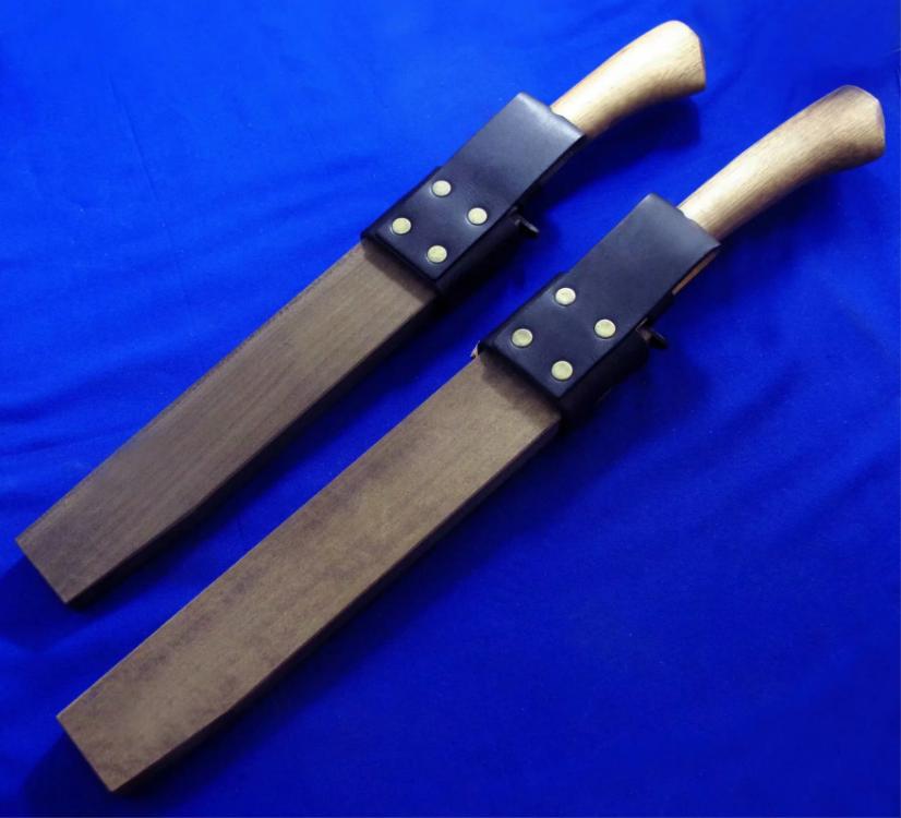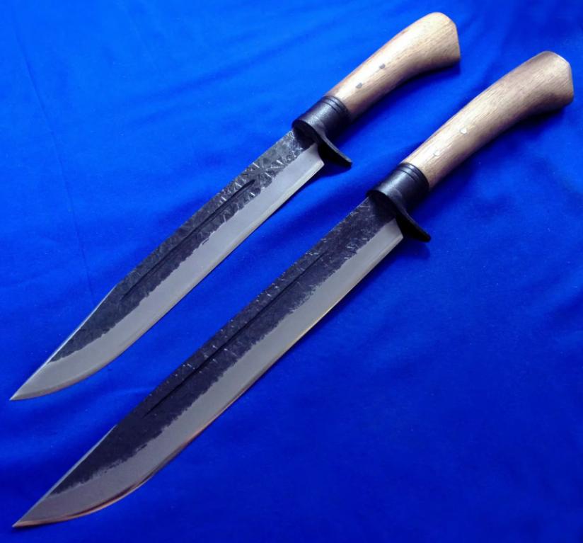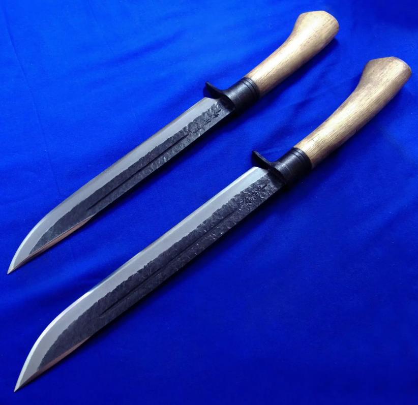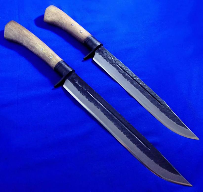 关兼常 高配版(三美版)KB-118(大)119(小)超级蓝钢 猎熊刀。 全长:40.5(大)37(小)cm。 刃厚:6.2mm。 刃材:Super Blue Steel San Mai(超级蓝钢三美钢)。 硬度:63-65。 柄材:橡木。 鞘材:樱花木+牛皮。 产地:日本。