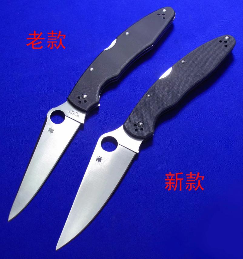 蜘蛛 新款C07。新款收纳比更佳,加长1.3cm(老款全长24cm),但手柄未加长,只加长了刀刃。刀片也比老款更宽(见图2对比图)。全长:25.3cm。刃厚:3.3mm。刃材:K390。硬度:60-62。柄材:G10。产地:日本。