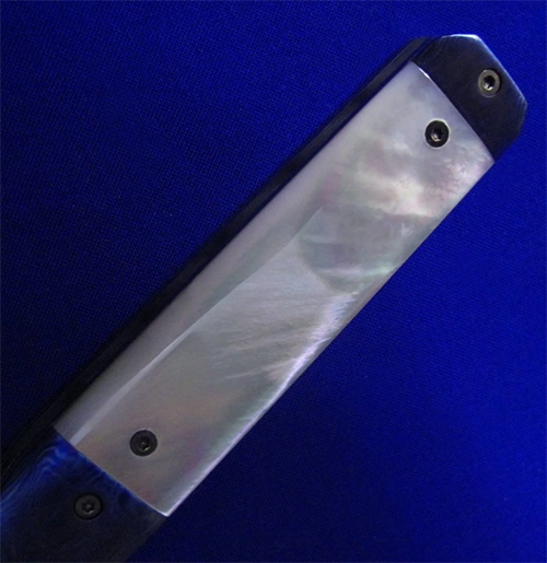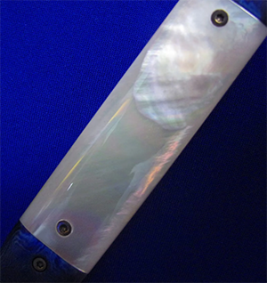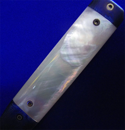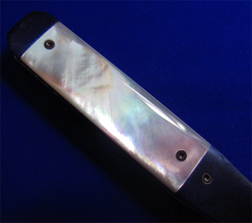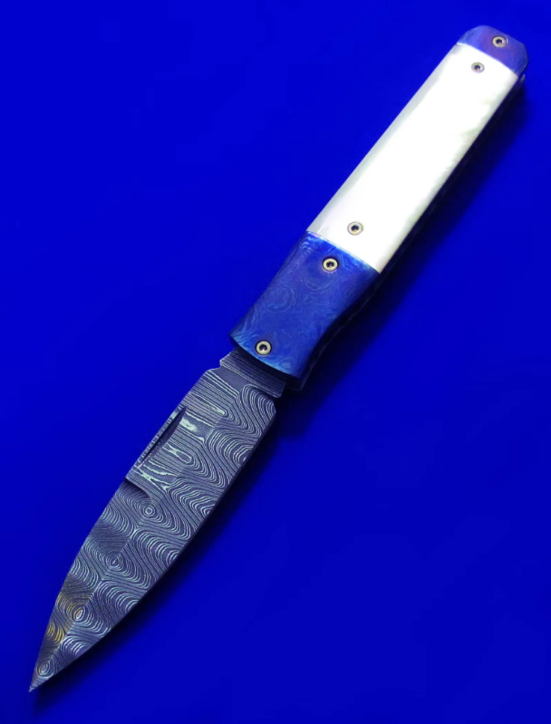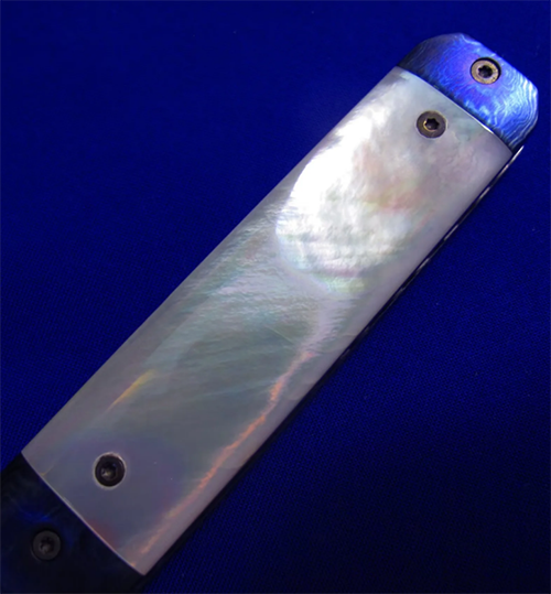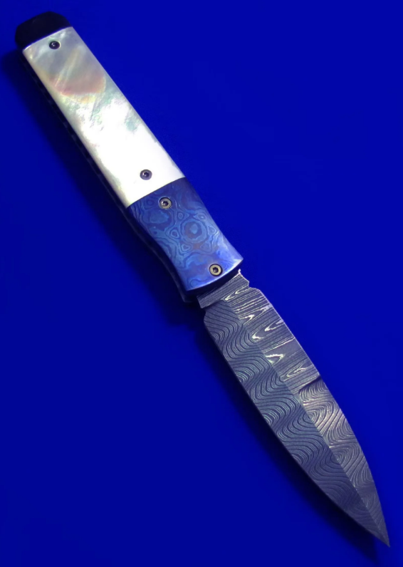 Gedraitis手工绅士折刀,孤品唯一。 古典锁(杠杆锁),非锁死。 全长:18.2cm。 刃厚:3.2mm。 刃材:大马士革。 硬度:60-62。 柄材:白蝶贝(贴片),钛马/彩色钛合金大马士革(手柄头尾),大马士革(背骨/背簧),钛合金(内衬)。 产地:美国。