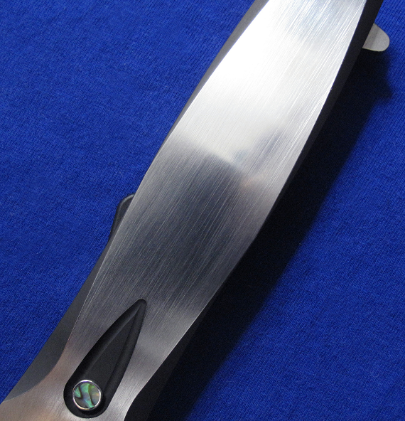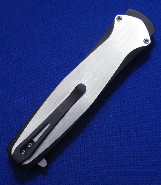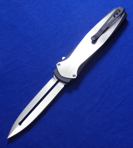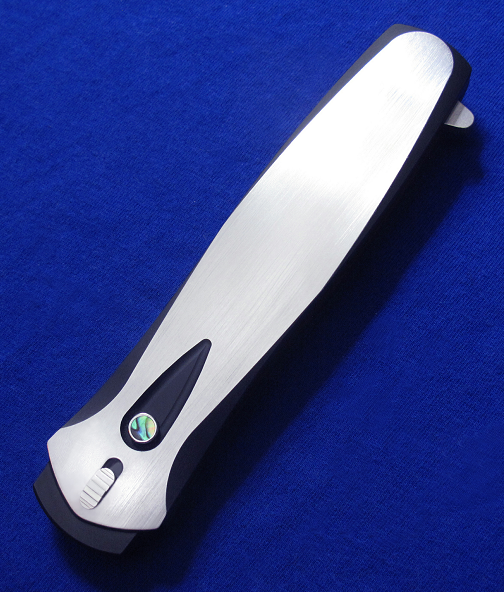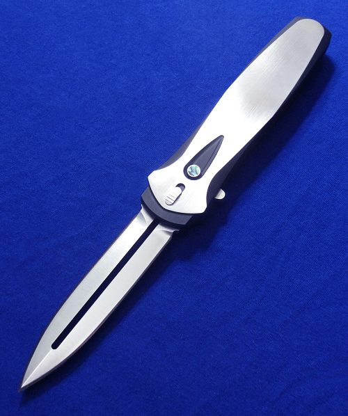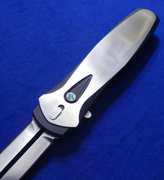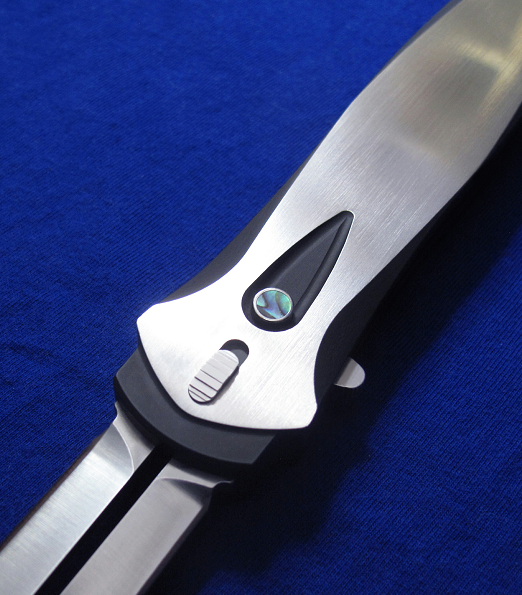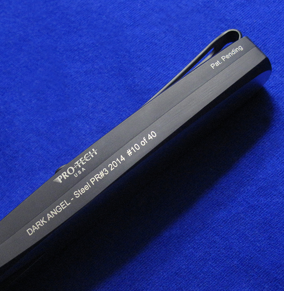 Protech Dark Angle手工限量版直跳。 限量40支,本支编号10。 精密度明显优于普通量产版,弹出收回非常丝滑。 全长:22.2cm。 刃厚:3mm。 刃材:CPM154。 硬度:60-62。 柄材:不锈钢手工拉丝,开刀钮镶嵌鲍鱼壳。 产地:美国。