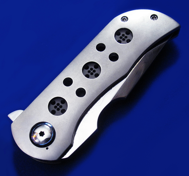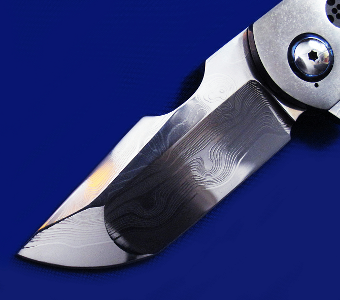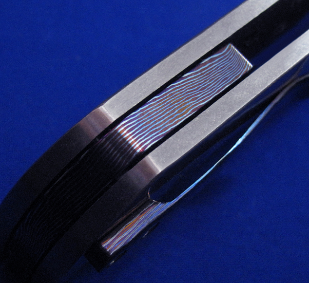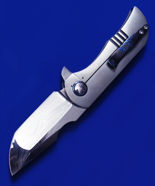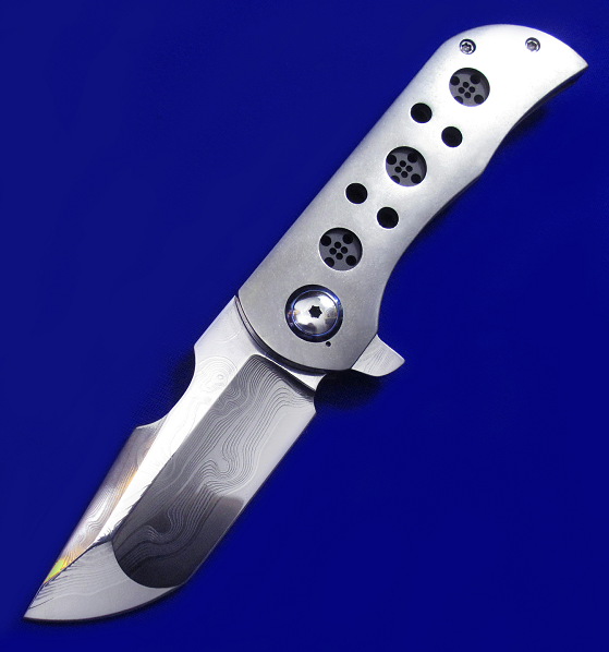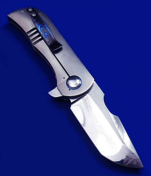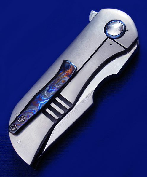 Robert Carter Flipper快开手工折刀。 顶配版本,孤品唯一。 全长:18cm。 刃厚:5.2mm。 刃材:大马士革(镜面处理)。 硬度:60-62。 柄材:钛合金贴片(石洗处理),锆马腰夹,彩色大马士革背骨及主轴套轴。 产地:美国。