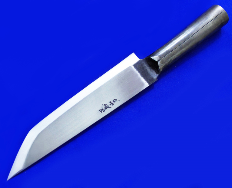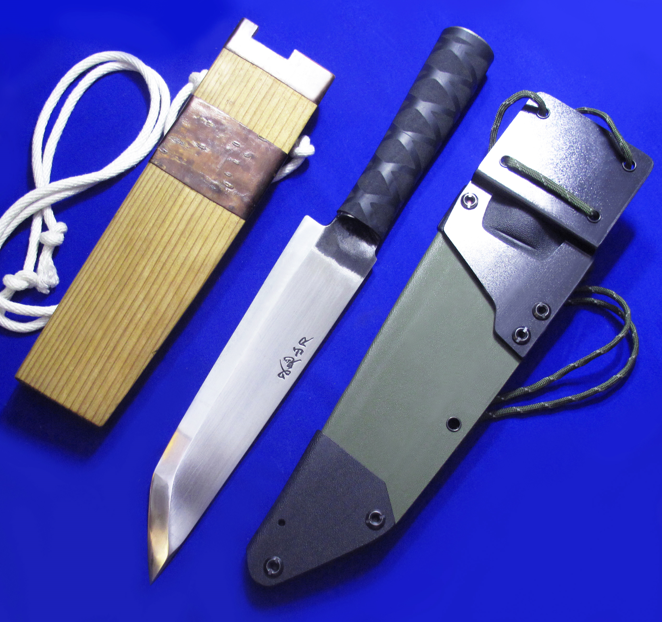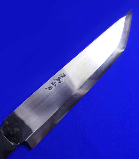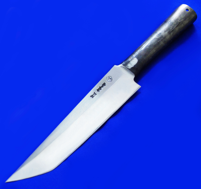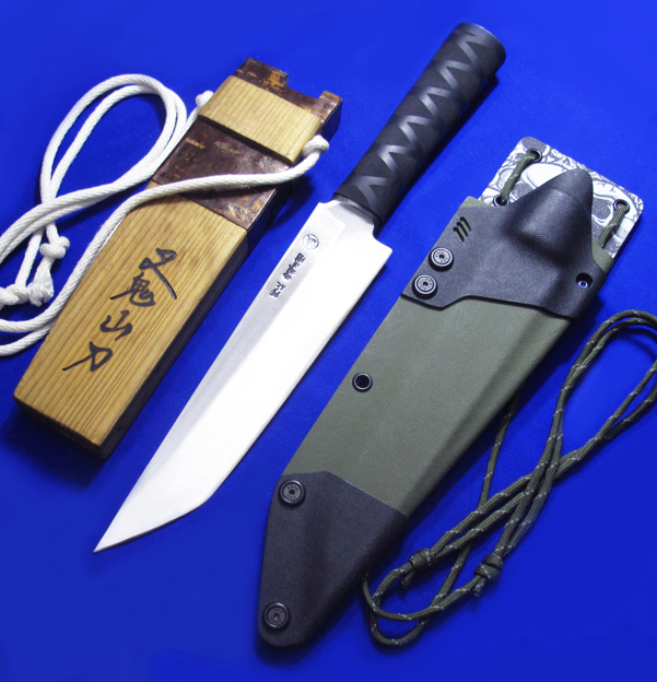 西根正刚(已故)叉鬼山刀,大号。 日本传统手工生存刀,顶配夹钢版本,稀有。 钻石刀尖(五面体刀尖),比普通三面体刀尖更坚固。 一体锻打中空柄,插木棍即是长矛。 全长:35.8cm。 刃厚:5.8mm。 刃材:超级青纸夹钢(西根正刚刀具多为单体钢,鲜少使用夹钢)。