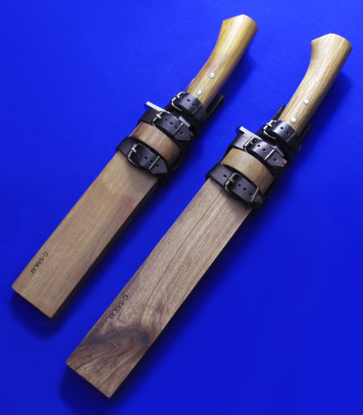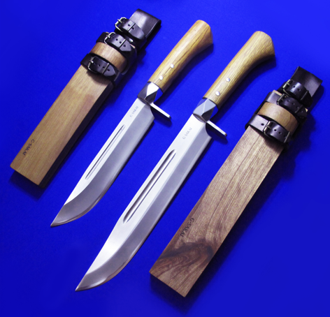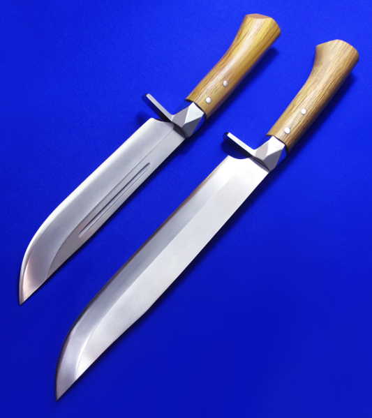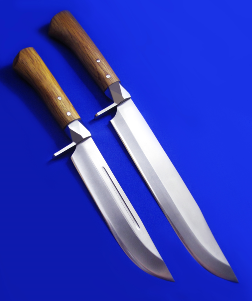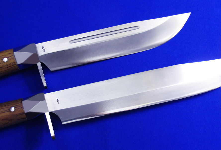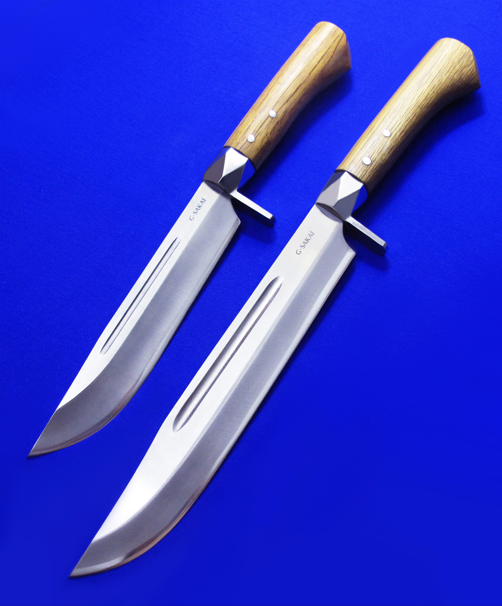 G.SAKAI重型手工猎熊刀。 早期产品,均已绝版。 全长:33.5(小),41(大)cm。 刃厚:6(小),5.8(大)mm。 刃材:白纸钢。