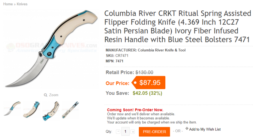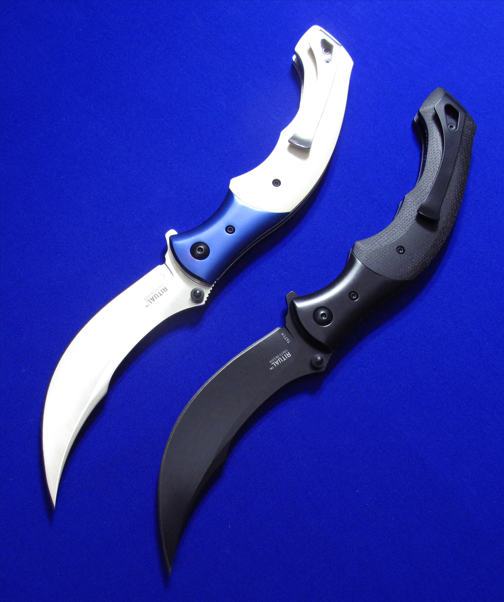 CRKT 7471半自动侧跳 波斯大折。 全长:25cm。 刃厚:3.2mm。 刃材:12C27(白款),14C28N(黑款),外网查证,两款钢材不同。 柄材:T6刀枕,象牙米卡塔贴片(白款),亚麻米卡塔贴片(黑款),不锈钢内衬。 产地:中国代工。