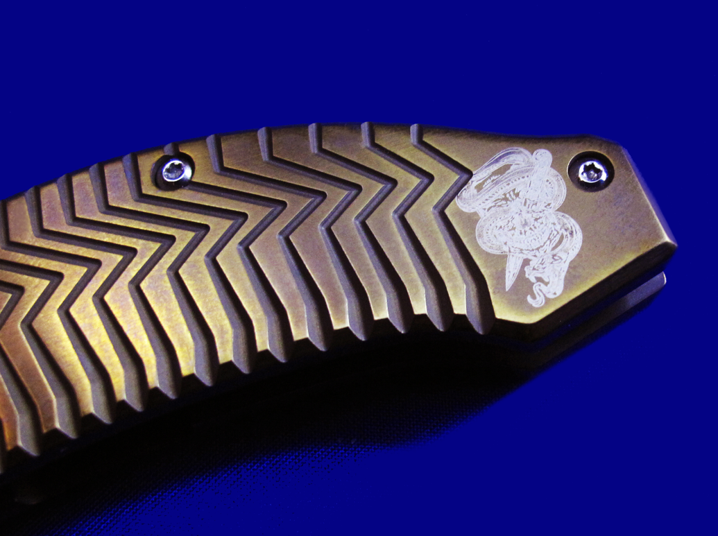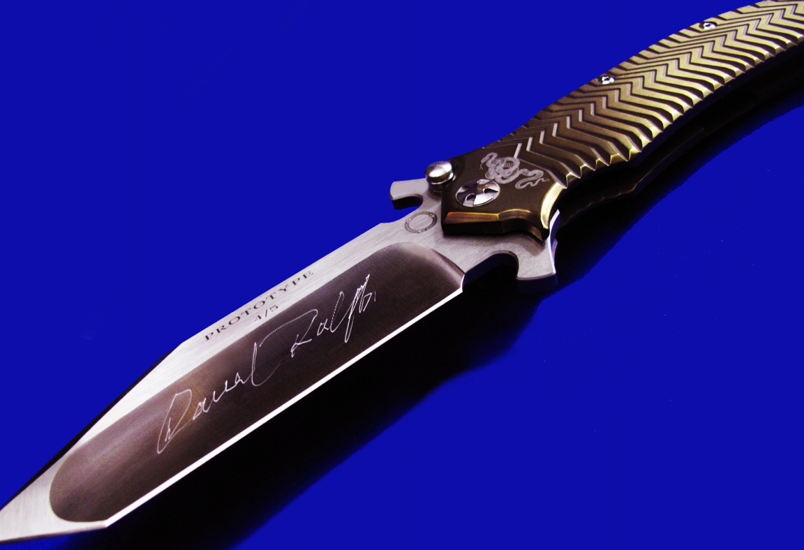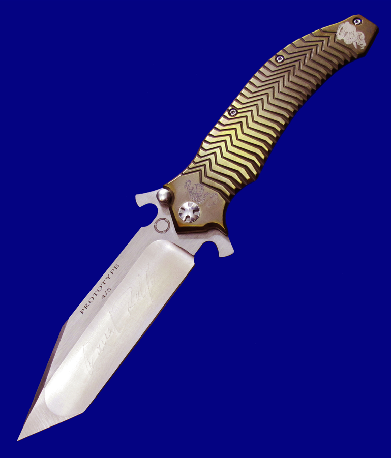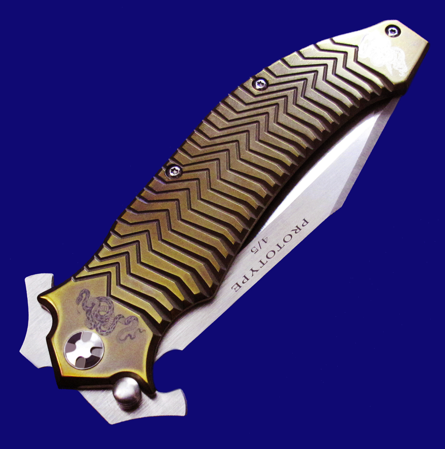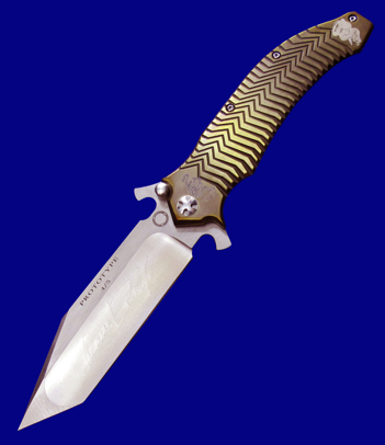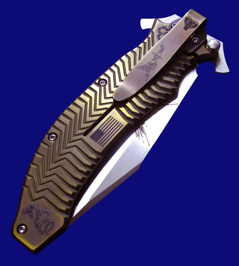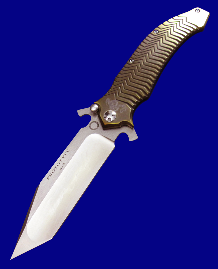 DDR 限量版Prototype手工原型敢死队,Flipper快开,大号(L号)。 存世5支,本支4号。 附注:《敢死队》电影里面杰森.斯坦森扎篮球那支是XL超大号(28cm),这支是L号(大号,25cm,也很大)。本来L是作为主流标准款销售,但电影上映后,XL爆红,造成后期XL产量暴增成为主流,L产量反倒不多。 全长:25cm。 刃厚:4mm。 刃材:CPM S35VN。 柄材:钛合金(青铜色/古铜色)。 产地:美国。
