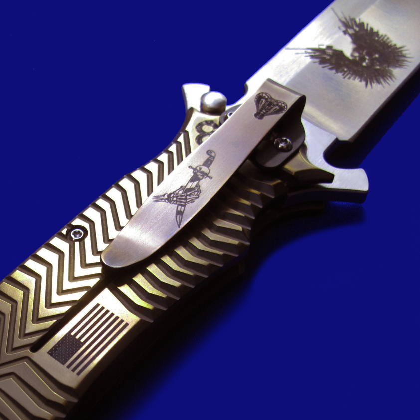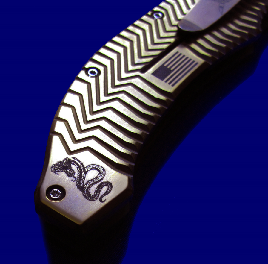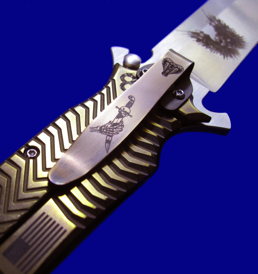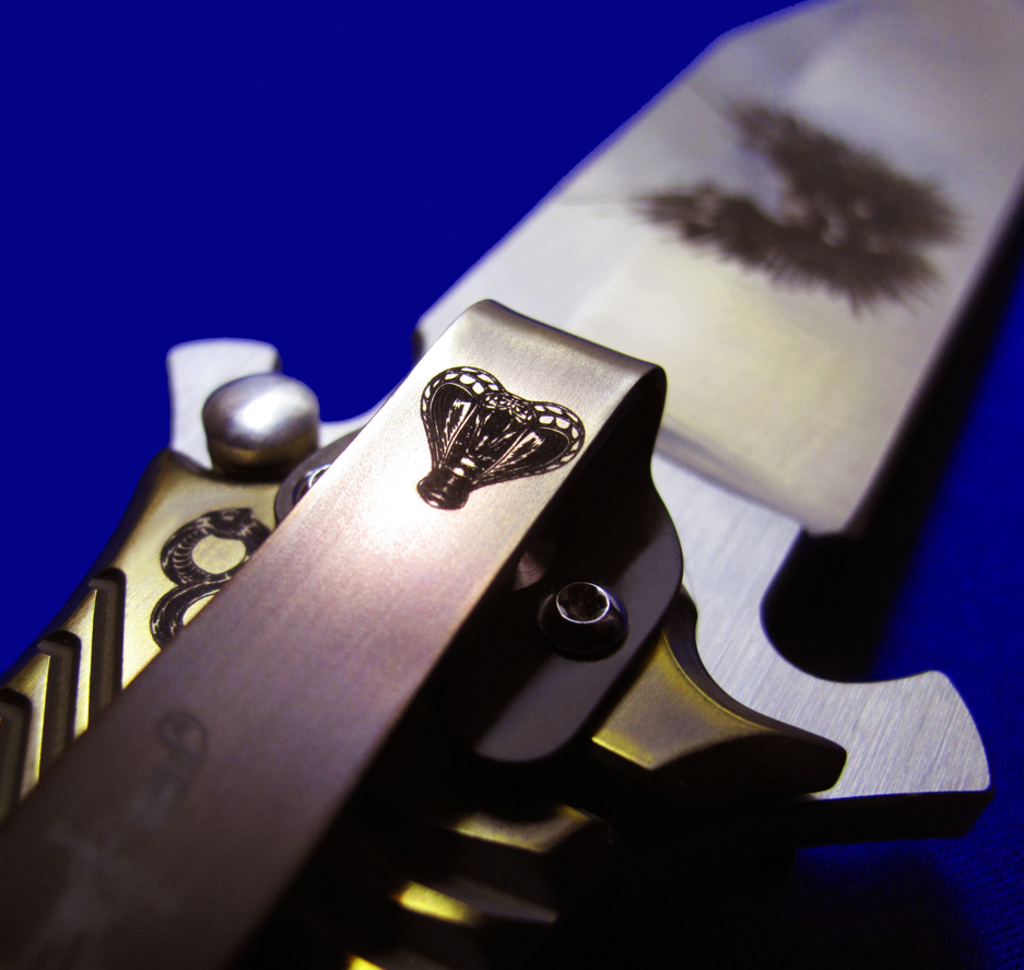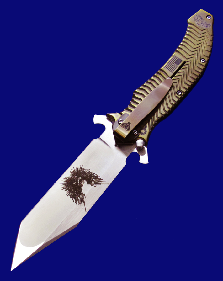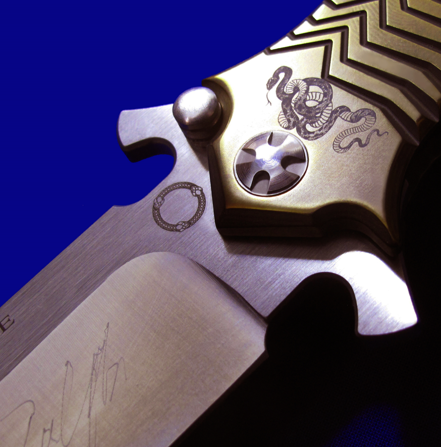 DDR 限量版Prototype手工原型敢死队,Flipper快开,大号(L号)。 存世5支,本支4号。 附注:《敢死队》电影里面杰森.斯坦森扎篮球那支是XL超大号(28cm),这支是L号(大号,25cm,也很大)。本来L是作为主流标准款销售,但电影上映后,XL爆红,造成后期XL产量暴增成为主流,L产量反倒不多。 全长:25cm。 刃厚:4mm。 刃材:CPM S35VN。 柄材:钛合金(青铜色/古铜色)。 产地:美国。
