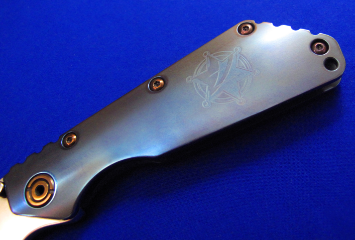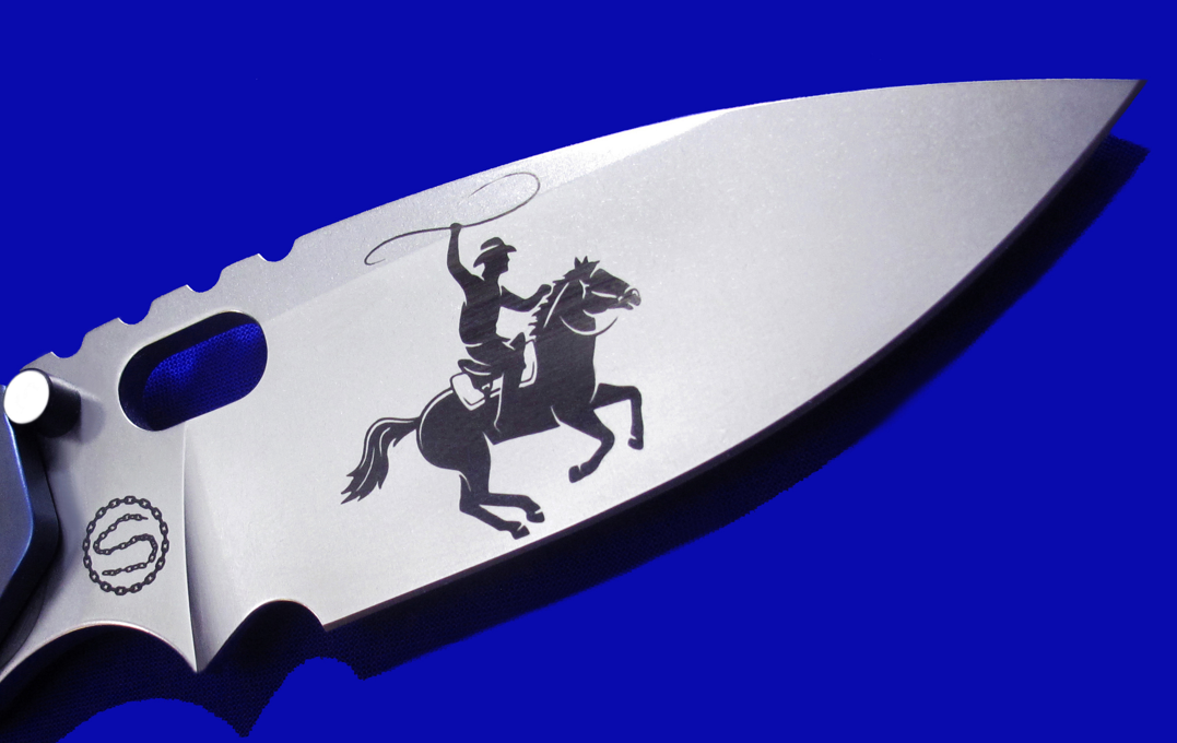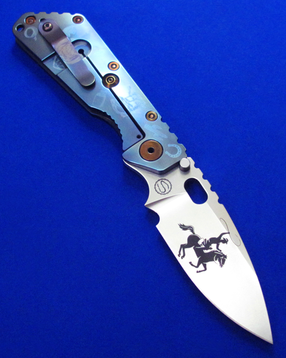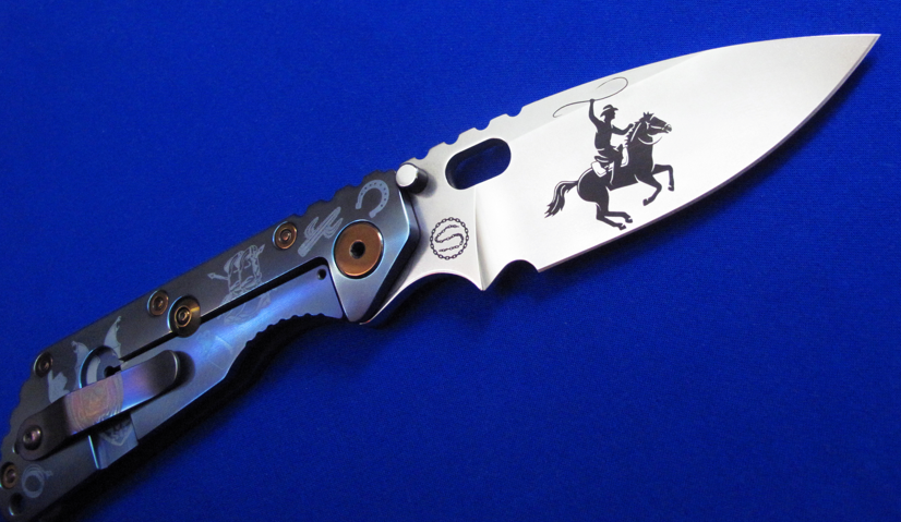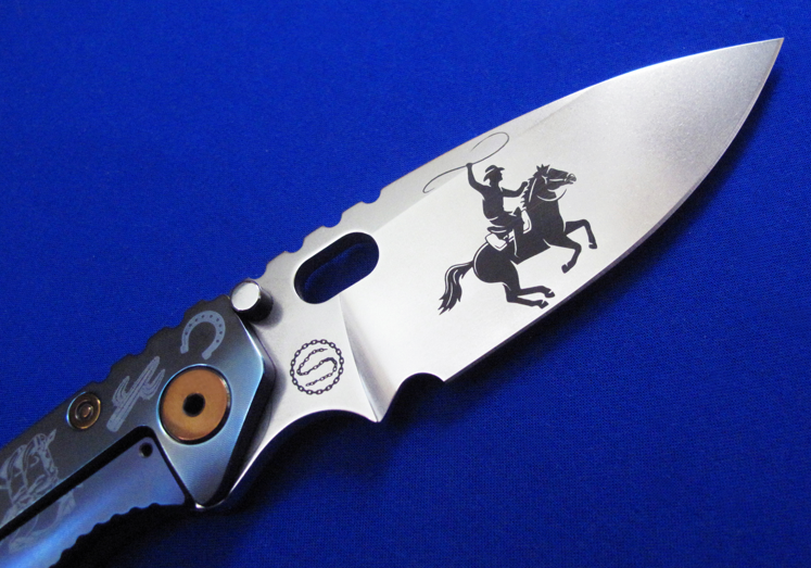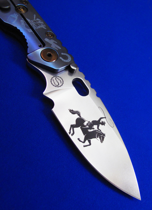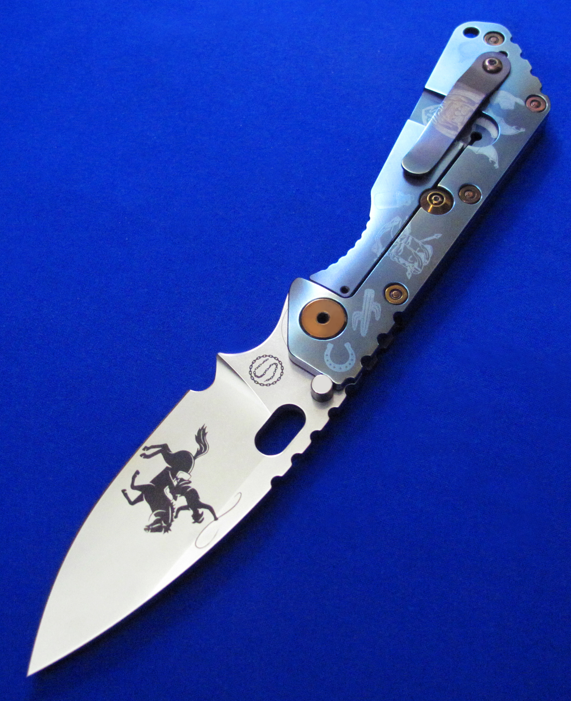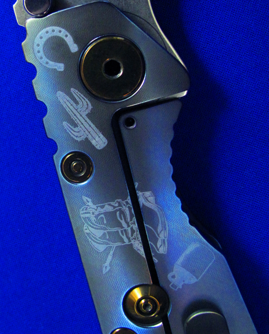 MSC(Mick Strider Custom)SMF手工折刀,重型版,COWBOY牛仔,ONE OFF孤品唯一。 手柄背面图案比较多,包括:马蹄铁,仙人掌,马靴,酒壶,牛仔帽,套马缰。以及MSC骷髅火焰标。 全长:23cm。 刃厚:5mm。 刃材:CTS-204P。 柄材:钛合金。 产地:美国。