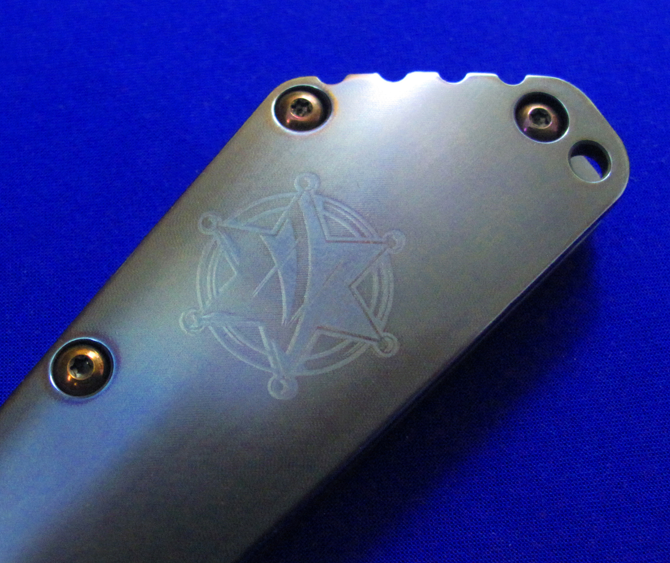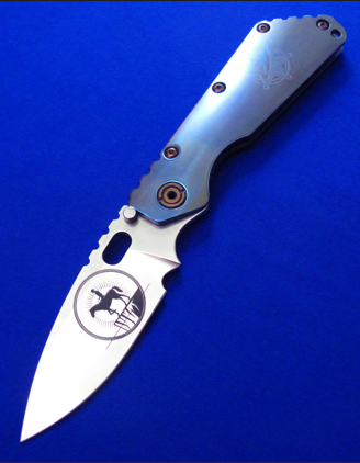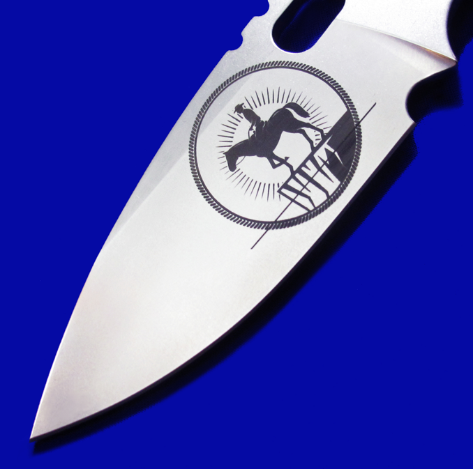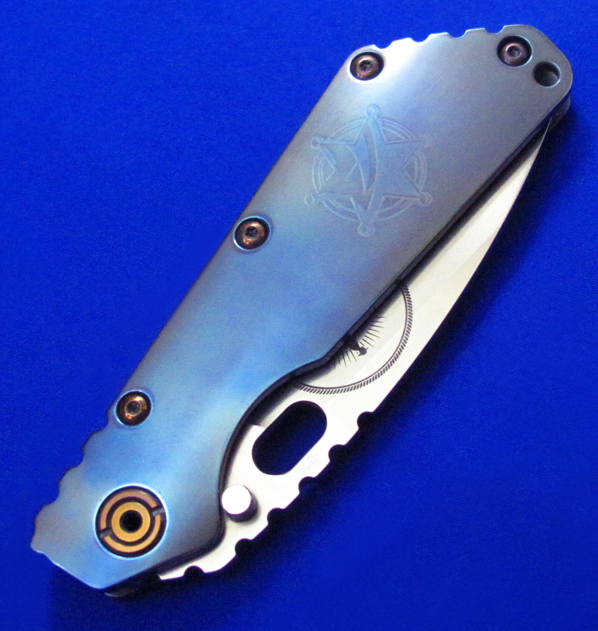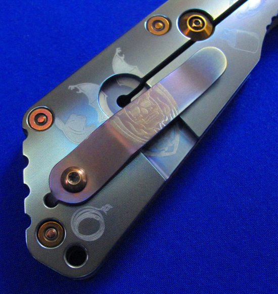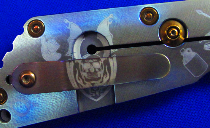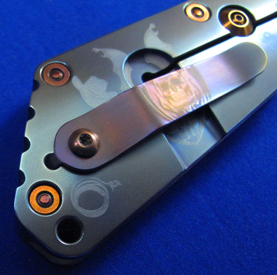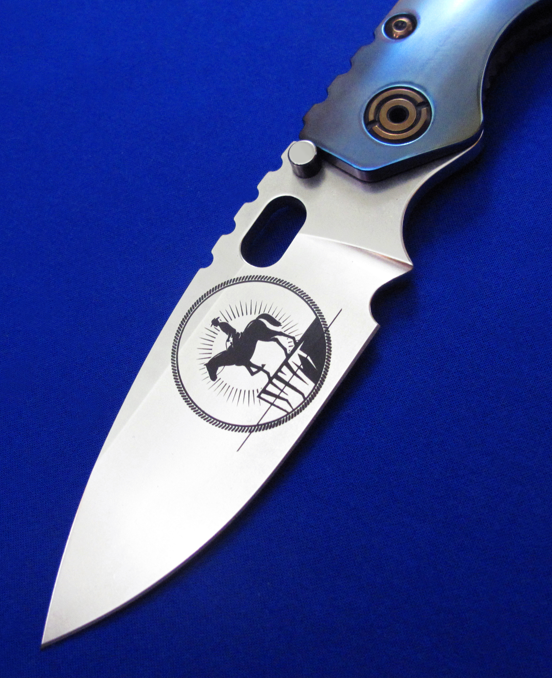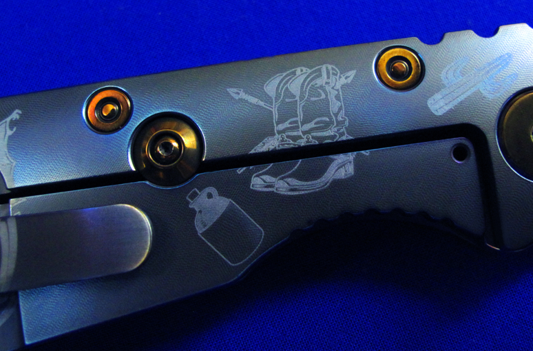 MSC(Mick Strider Custom)SMF手工折刀,重型版,COWBOY牛仔,ONE OFF孤品唯一。 手柄背面图案比较多,包括:马蹄铁,仙人掌,马靴,酒壶,牛仔帽,套马缰。以及MSC骷髅火焰标。 全长:23cm。 刃厚:5mm。 刃材:CTS-204P。 柄材:钛合金。 产地:美国。