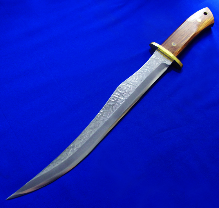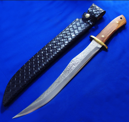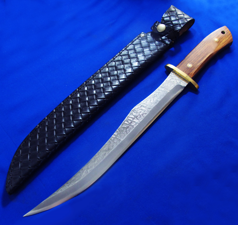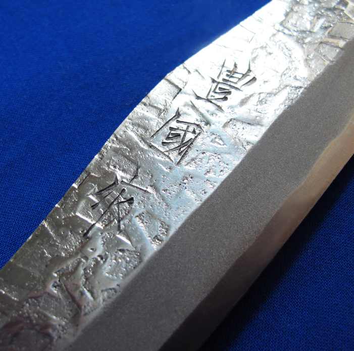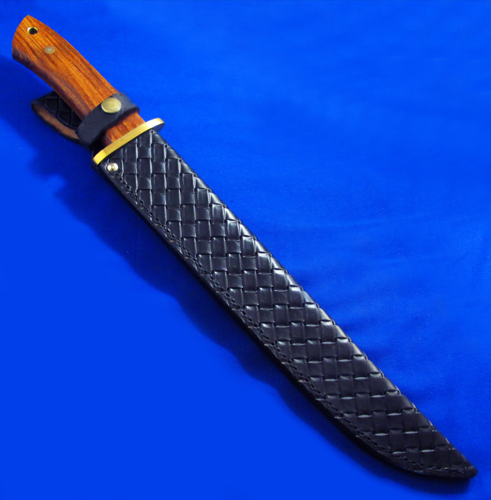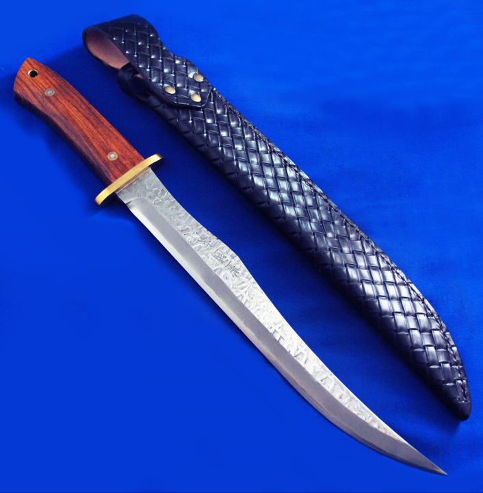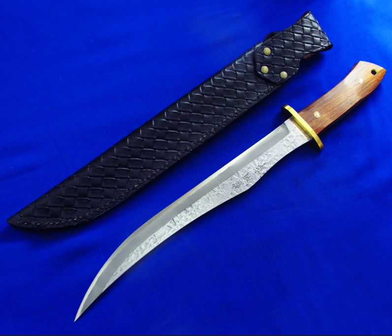 丰国手工 斩鬼妖刀。 全长:45.5cm。 刃厚:6mm。 刃材:Super Blue Steel San Mai(超级蓝钢三美钢)。 硬度:63-65。 柄材:黄檀木+黄铜。 鞘材:压花牛皮。 产地:日本。