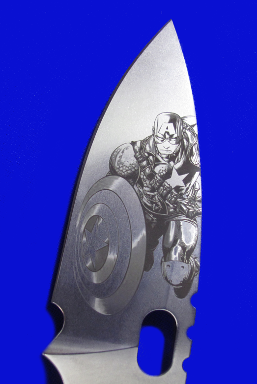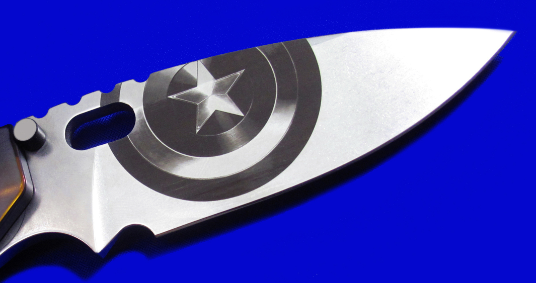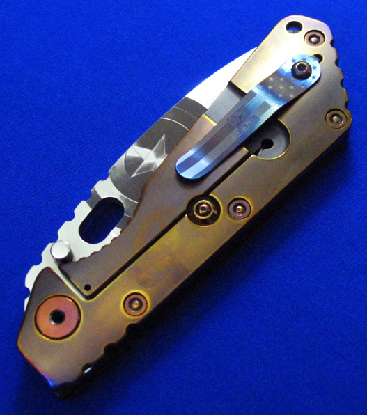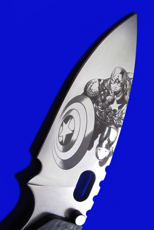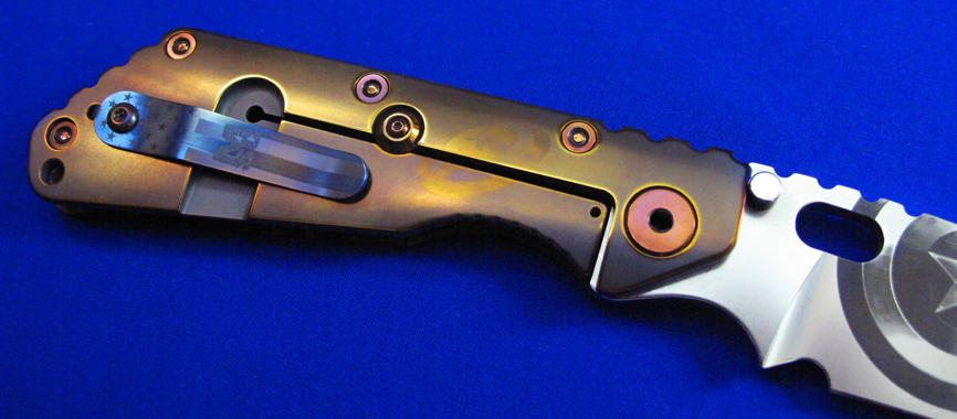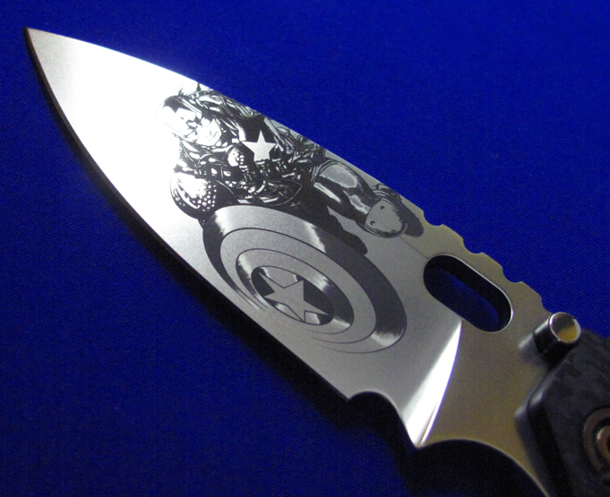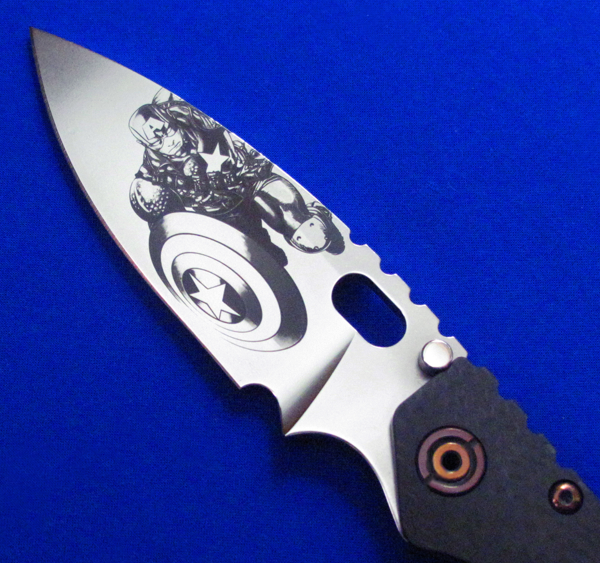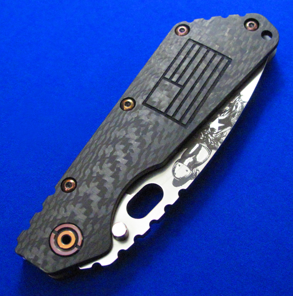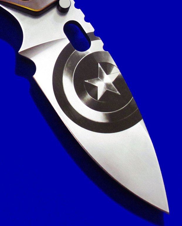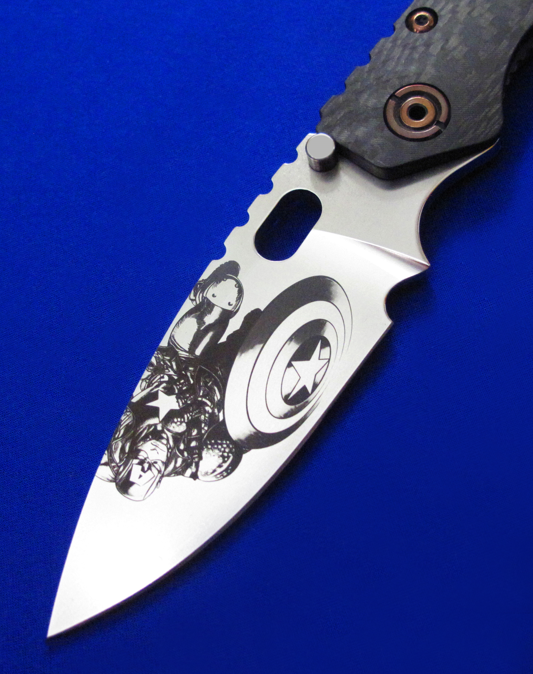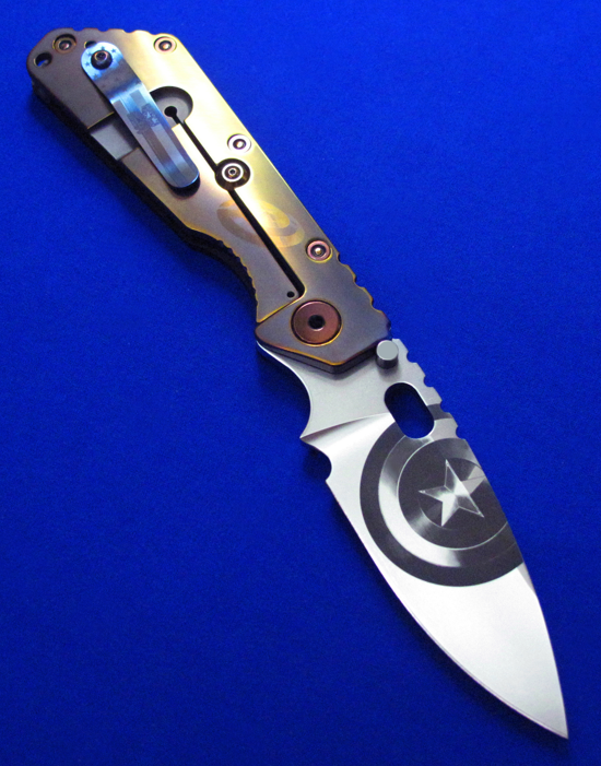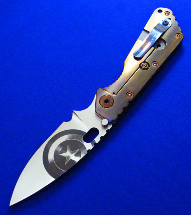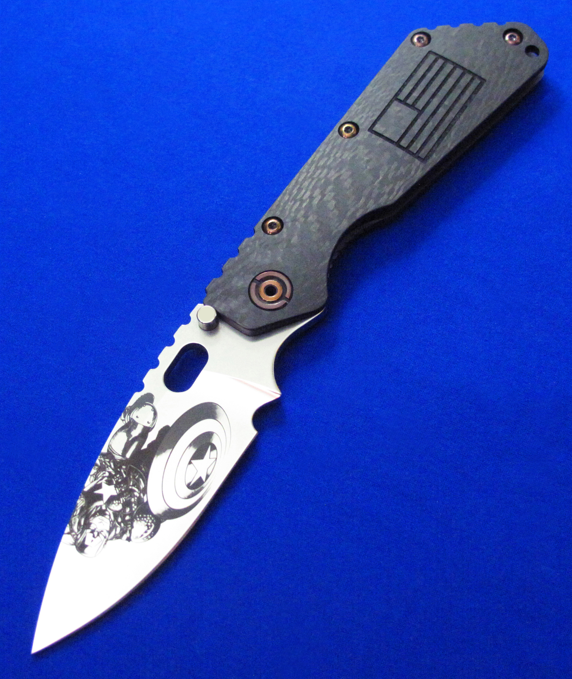 MSC(Mick Strider Custom)SMF手工折刀,美国队长,ONE OFF孤品唯一。 全长:23cm。 刃厚:5mm。 刃材:CPM 20CV。 柄材:正面碳纤维,背面钛合金。 产地:美国。