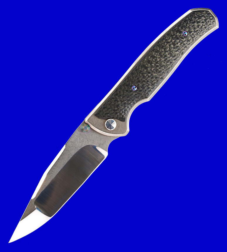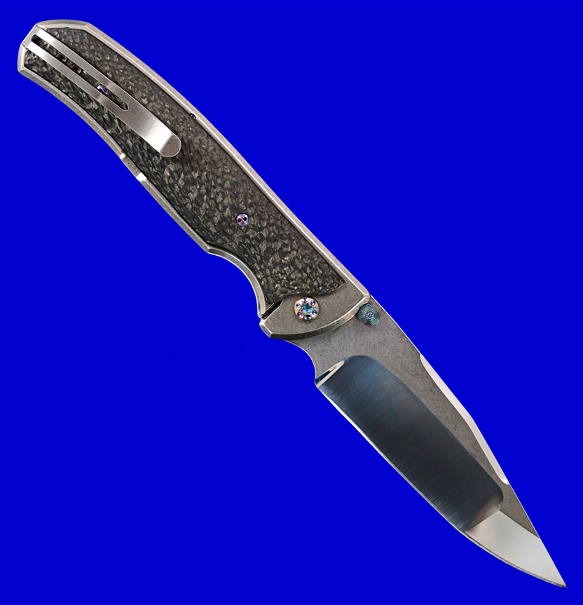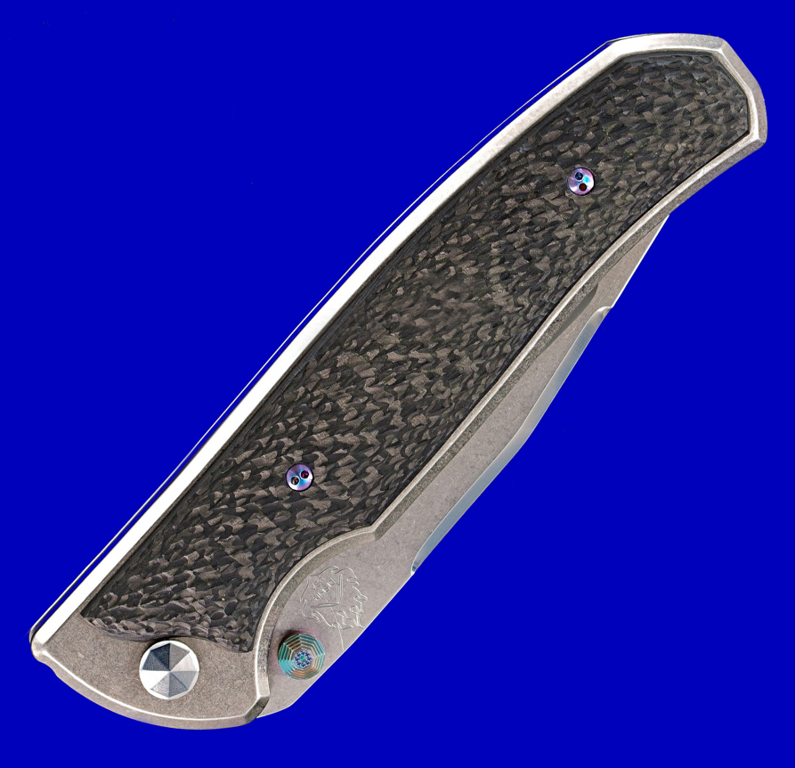 Matt Diskin马特.迪斯金 D/A(双动)手工折刀。 既可全自动侧跳(机关隐藏),亦可传统手动开启,两种玩法。 全长:20.8cm。 刃厚:3mm。 刃材:S35VN。 柄材:碳纤维,钛合金。 产地:美国。