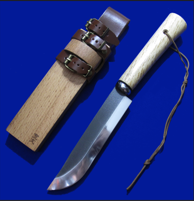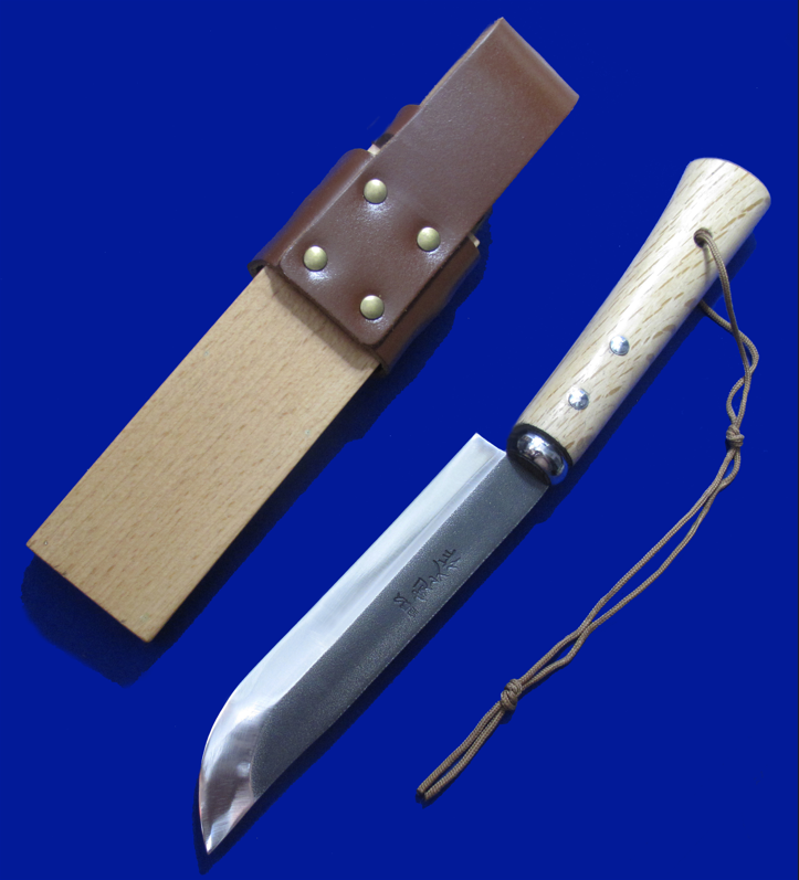 宽文日式传统小猎熊。 全能尺寸生存刀,小日本SRK。 做工粗犷,完美主义慎购。 全长:31.5cm。 刃厚:4.8mm。 刃材:白纸夹钢(白纸三枚合)。 柄材:玉兰木。 鞘材:樱花木,牛皮。 产地:日本。