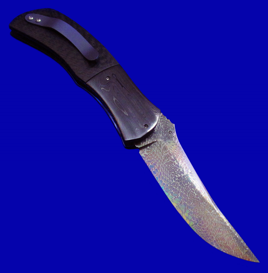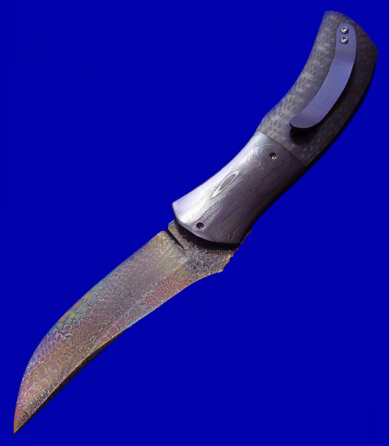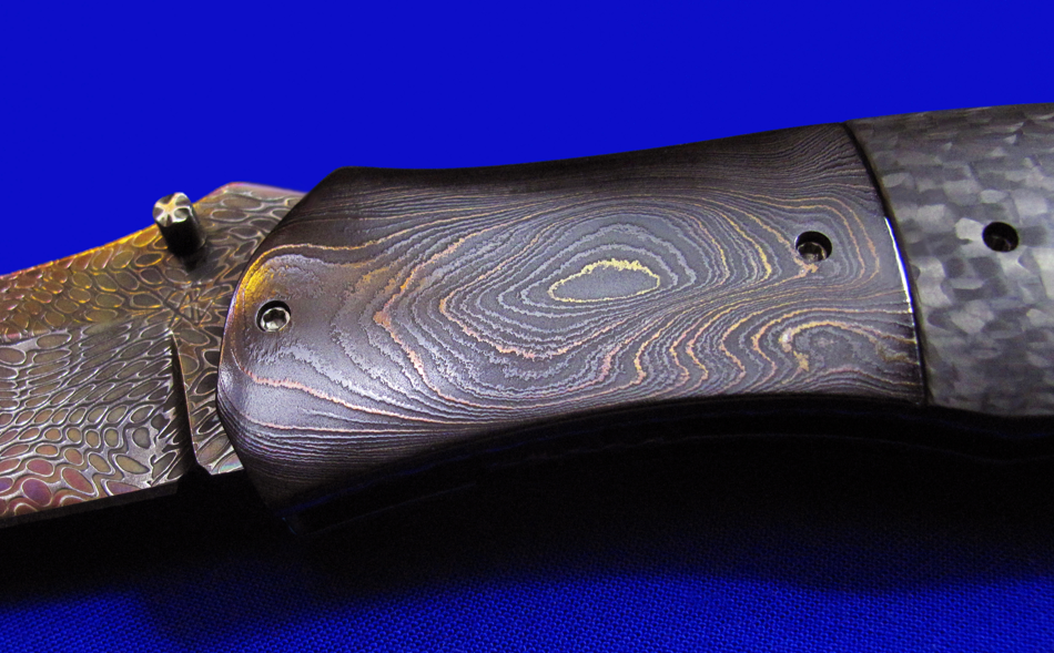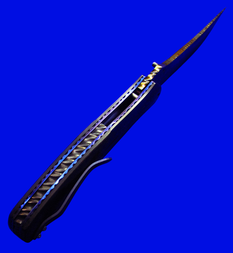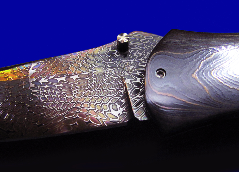 刃材是目前为止最抗损的立体龙鳞彩色大马。通常彩色大马的通病是表面不耐磨,受损后即露白,慢慢颜色就磨没了。