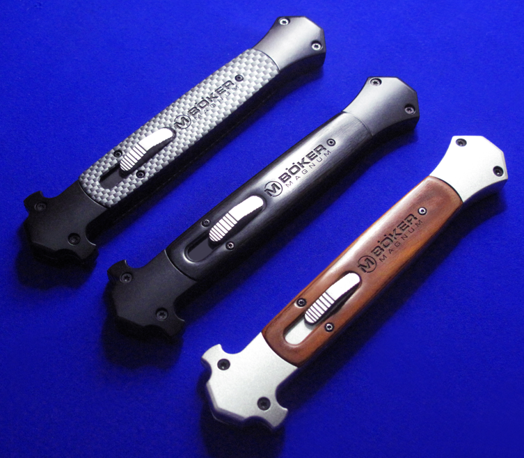 BOKER博克马格南 西西里全自动直跳,XXL。 提示:请留意尺寸,这是XXL,比XL还要大。 全长:32.8cm。 刃厚:2.8mm。 刃材:4034。 柄材:T6骨架,实木贴片。 产地:中国代工(博克的马格南系列,产地都是中国)。 提示:低端直跳不要和微技术比,完美主义慎购。