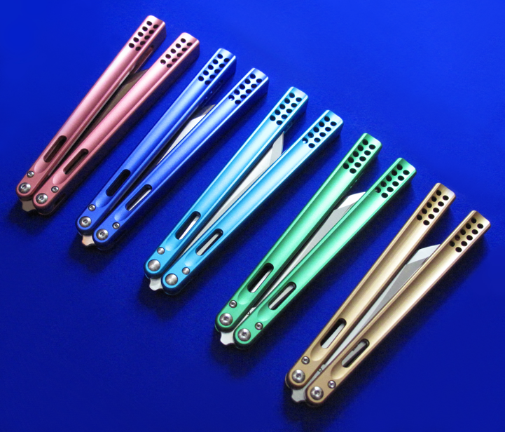 MERCURY平价版甩刀。 强壮一体柄,非三明治结构。 平价版塑料袋包装,非纸盒包装。 颜色左至右:粉、宝石蓝、湖蓝、绿、淡金(土豪金)。 全长:25.3cm。 刃厚:3mm。 刃材:D2。 柄材:T6 6061。 产地:意大利。