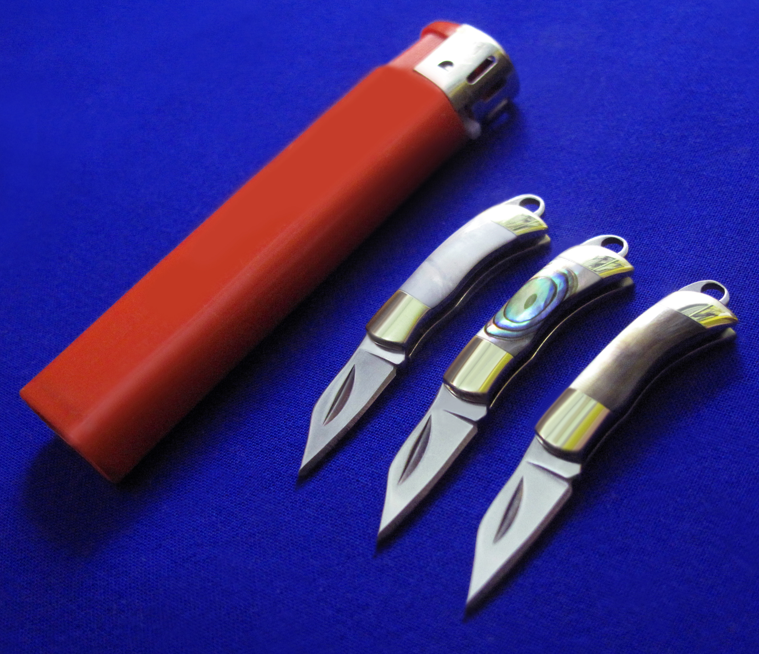 全长5cm,柄材彩蝶贝+黄铜,无锁,刃材不详(估计440或420),日本产。