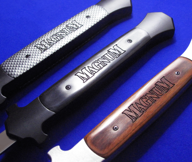BOKER博克马格南 西西里全自动直跳,XXL。 提示:请留意尺寸,这是XXL,比XL还要大。 全长:32.8cm。 刃厚:2.8mm。 刃材:4034。 柄材:T6骨架,实木贴片。 产地:中国代工(博克的马格南系列,产地都是中国)。 提示:低端直跳不要和微技术比,完美主义慎购。
